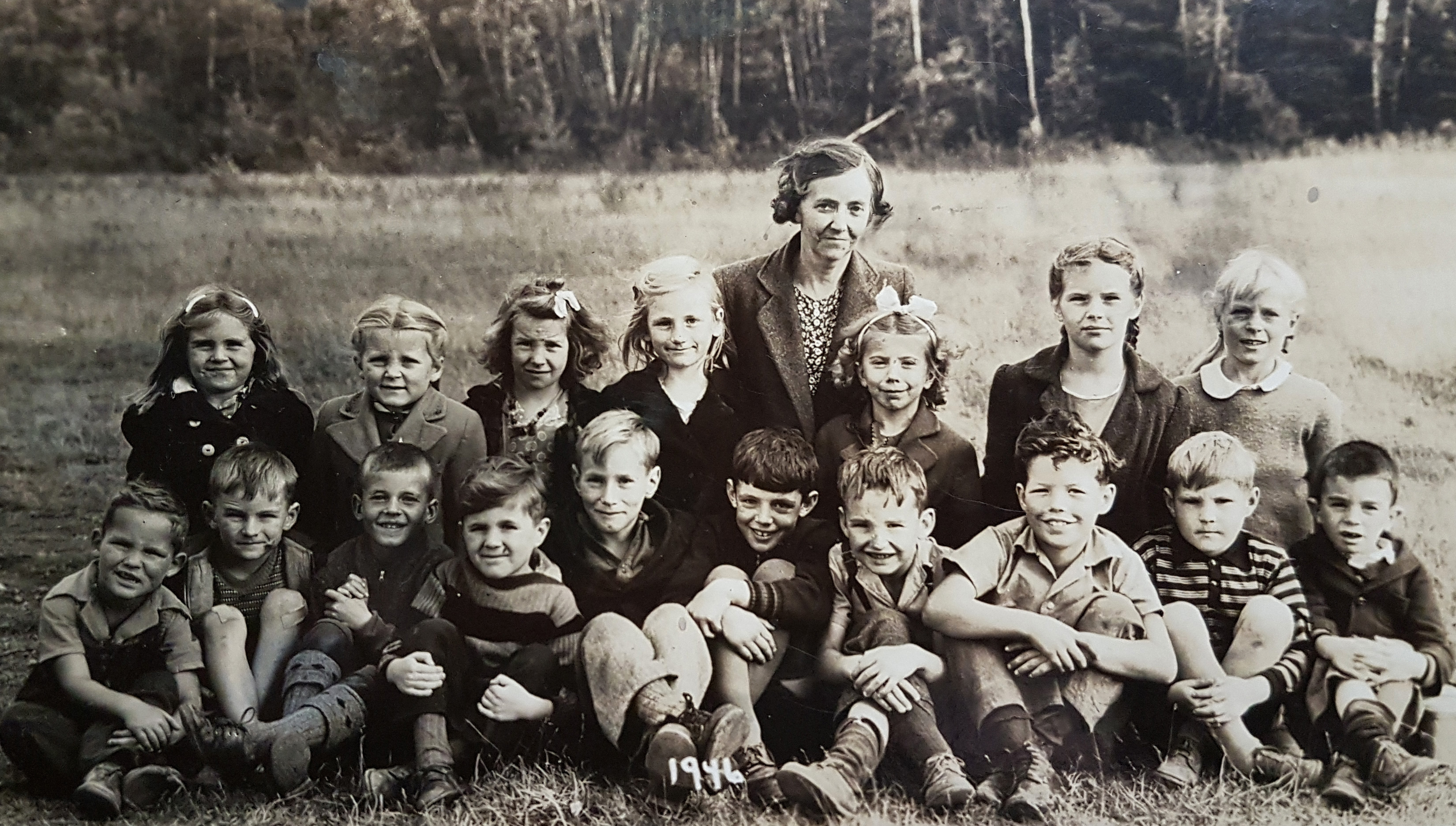 Grades 1 and 2 of the Tatamagouche Elementary School, 1946. Back row (L-R): Sandy Byers, Marilyn Griffin, Leona Mattatall, Ida Brown, Miss Hilda Langille, Meta Tattrie, Evelyn Coulter, Helen Cunningham. Front row (L-R): Dave Cox, Ron Campbell, Mickey Wallaneous, Floyd Tucker, Lawrence Weatherby, Allison Reid, Gary O'Neil, Clayton Langille, David Menzie, Vernon Veno. Missing: David Clark, Morris Cole, Lawrence Cole, Tillie Tucker. Photo Credit: Mrs. Em. M Harris, Lawrencetown, NS.
