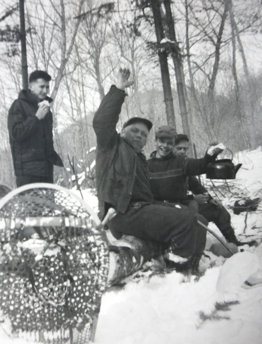 Survey crew around camp fire at lunchtime, Gatineau Hills, Quebec - circa 1959
