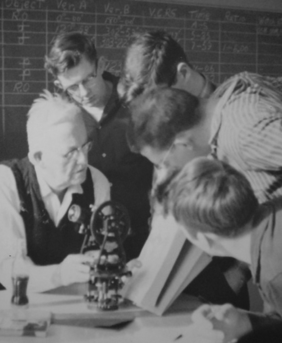 Major J.A.H. Church, PLS, instruction on use of transit, NSLSI, with Ron Wallis, Mike Milner, Ken MacDonald and John Covert