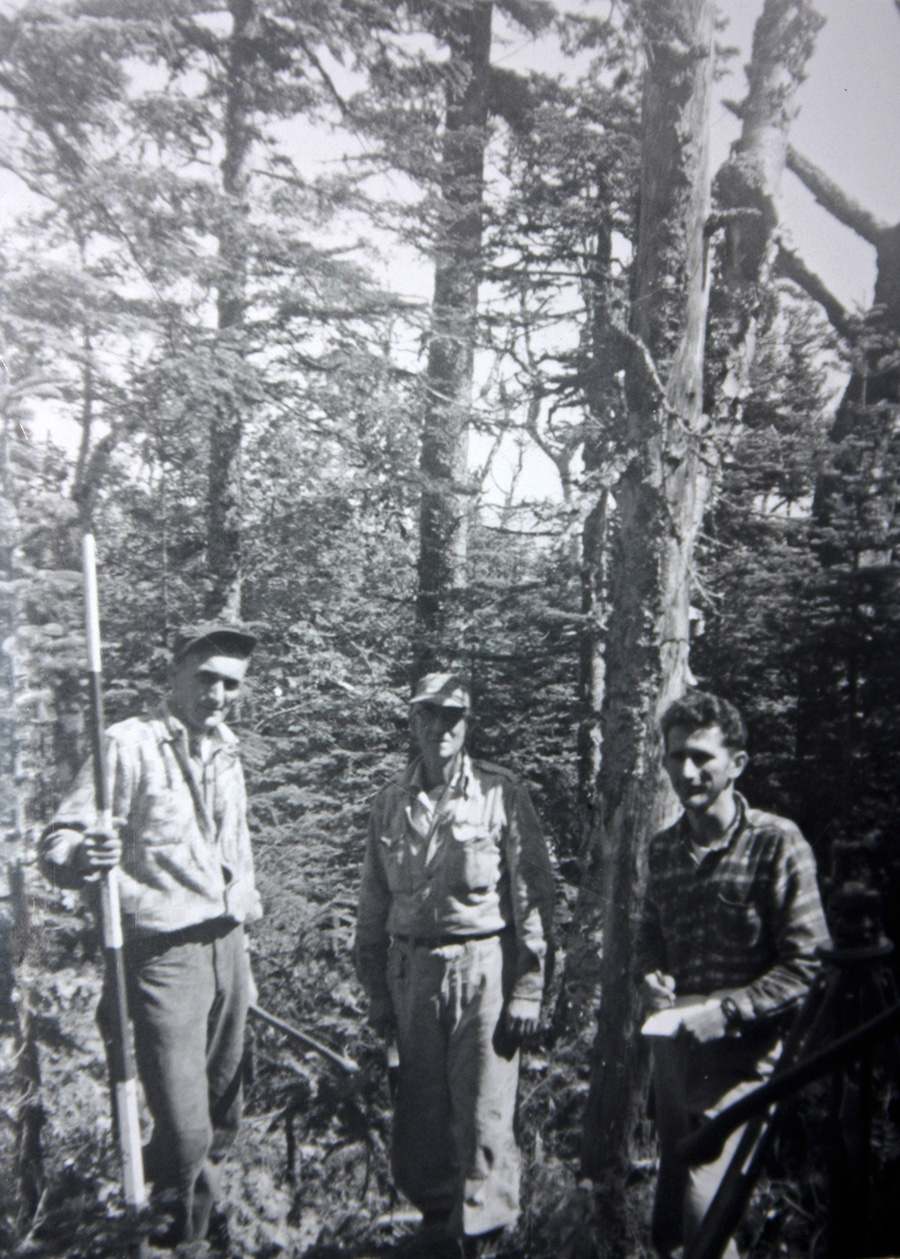 Crew surveying Crown Land boundary line, top of St. Anns Mountain, Victoria County